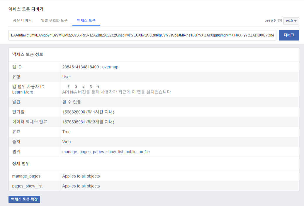 액세스 토큰 입력창에 방금 적어두었던 액세스 토큰을 입력한 뒤 디버그를 해보면