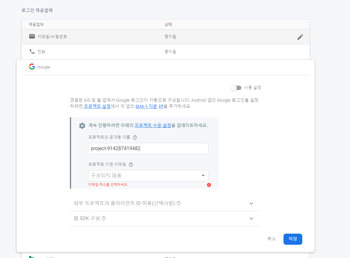 프로젝트 지원 이메일을 입력 후 저장을 눌러주면 파이어베이스에서의 설정은 끝입니다.