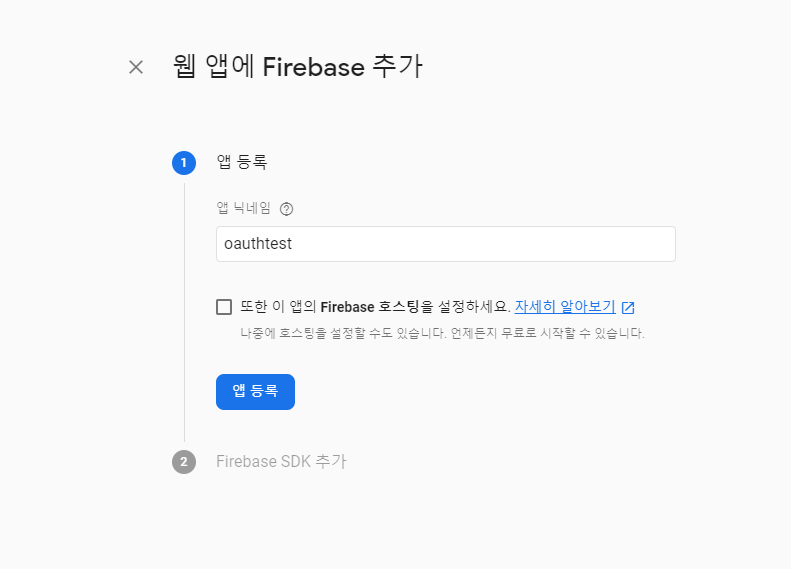 추가를 눌러주면 정말 Firebase 페이지 내에서 할 행위는 끝입니다.