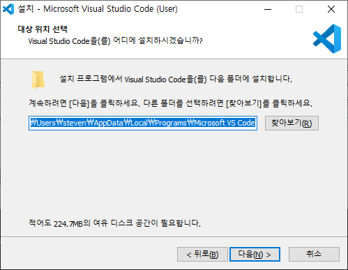 세 번째 화면에서는 설치 경로를 설정하는데 나중에 환경변수 설정 등이 귀찮을 수 있으니