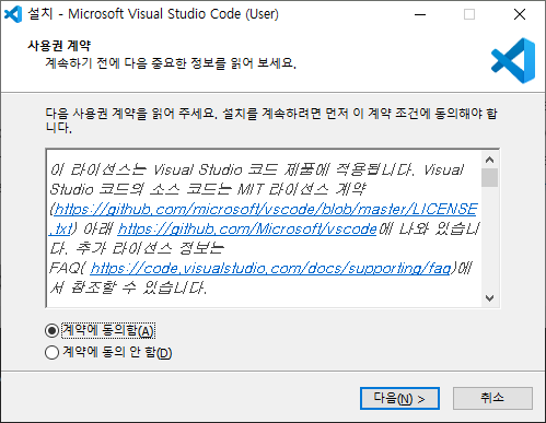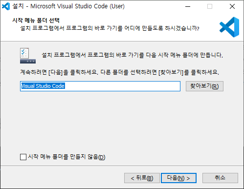 생성하지 않겠다면, "시작 메뉴 폴더를 만들지 않음(D)"을 체크 후 다음을 눌러주세요!