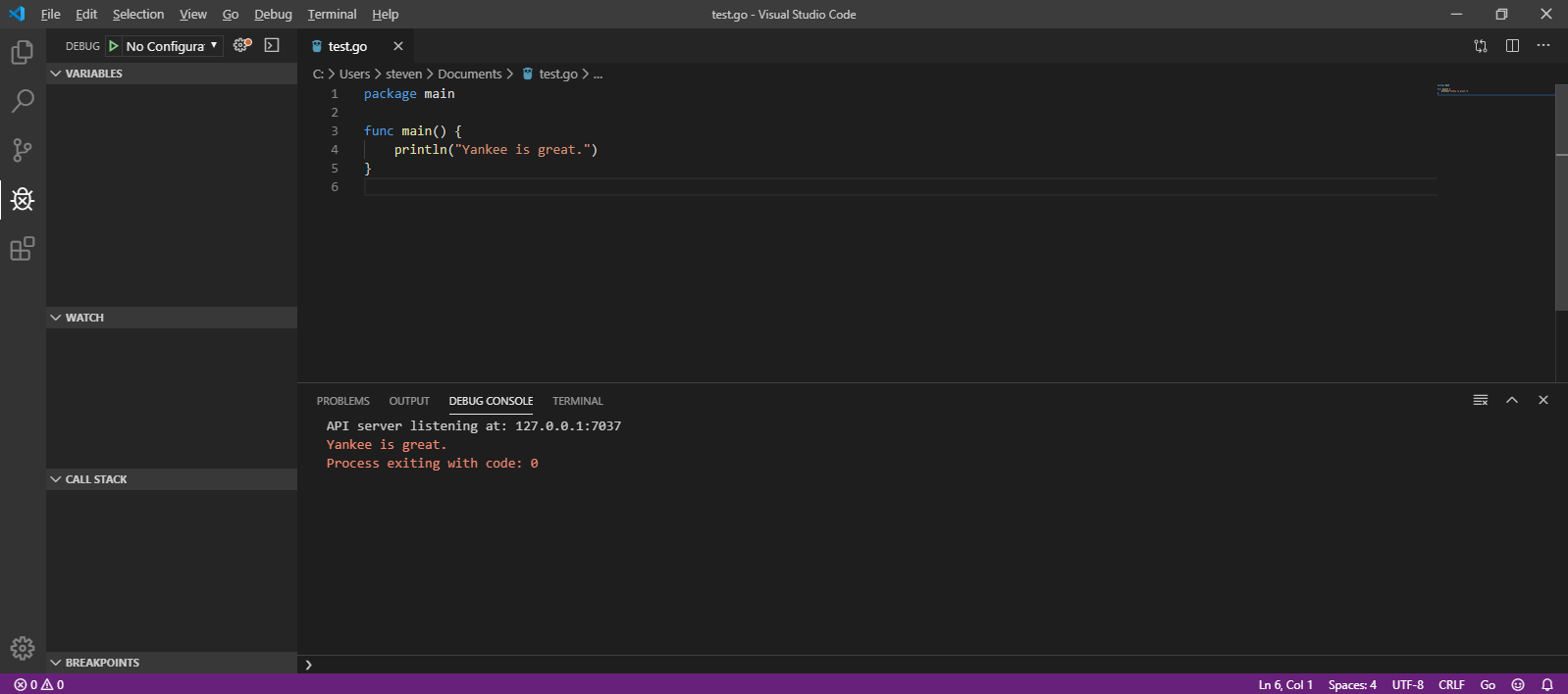 작성 후 ctrl + s를 눌러 저장하며 파일명은 test.go라고 작성 후 적당한 위치에 저장합니다.