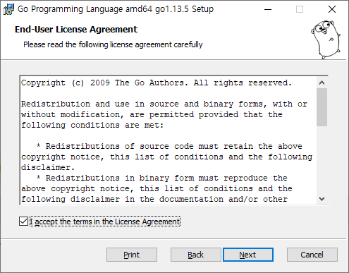 두 번째 화면에서는 Go언어의 License(라이선스)에 대해 언급되어 있습니다.