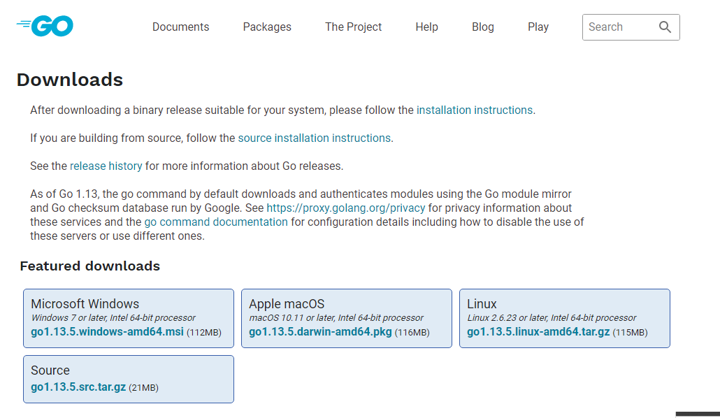 Downloads After downloading a binary release suitable for your system, please follow the installation instructions. If you are building from source, follow the source installation instructions. See the release history for more information about Go releases