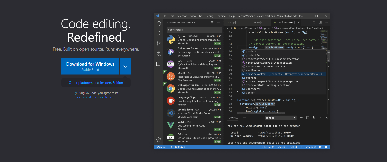 Visual Studio Code is a code editor redefined and optimized for building and debugging modern web and cloud applications. Visual Studio Code is free and available on your favorite platform - Linux, macOS, and Windows.