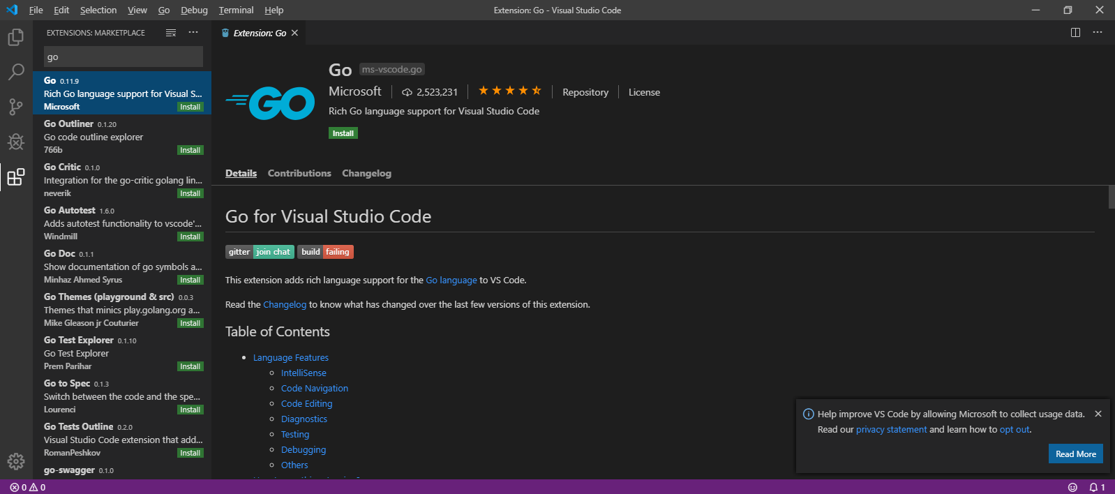 이렇게 Go언어를 vscode에서 사용할 수 있도록 도와주는 플러그인이 있는데